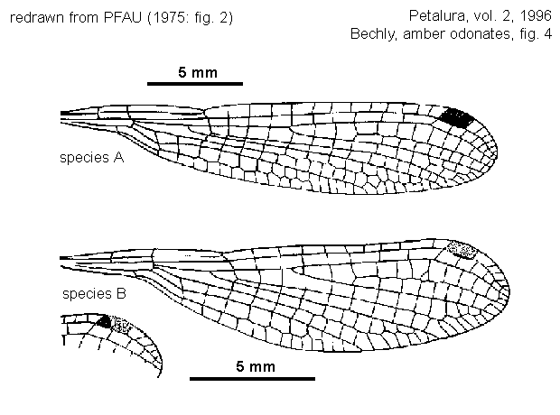 are now located in the "Geologisch-Paläontologisches Institut der Universität" Göttingen / Germany (species A: no. 3 B 696; and species B: no. K 8088). These specimens were described and figured by PFAU (1975) (see fig. 3, fig. 4 and fig. 5). They are remarkably well preserved and seem to represent female specimens of two different Coenagrionoidea species of the Upper Eocene, which are still unnamed. Pfau's suggestion that these fossils might belong to the Recent family Platycnemididae is not really supported by the available evidence, so that these fossils should rather be regarded as Coenagrionoidea incertae sedis. According to Pfau one of the species might be conspecific with "Agrion antiquum" Hagen.