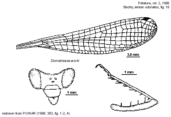 - 10.) POINAR (1996) described a new species of the recent coenagrionid genus Diceratobasis (see fig. 16) from a piece of Dominican amber that is located in the private collection of Jim Work (Ashland, Oregon, USA). The larvae of this species probably lived in phytotelmata of tank bromeliads.