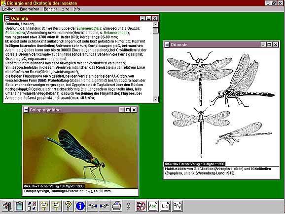 This CD-ROM in German language is a multimedial version of the famous standard text-book "Biologie und Ökologie der Insekten" by JACOBS & RENNER. The book has been completely revised and amended by K. HONOMICHL and H. BELLMANN. The complete text and all illustrations of the third edition of this book, which will not be available before fall 1997, are present on the CD-ROM version too. Under the name of a order or family one can find detailed informations about the biology and ecology of the taxon and its more common species. Additional to the 1201 black & white graphics of the book version, there are 1001 colour photos (BMP), 15 videos (AVI) and 23 sounds (WAV). A major advantage of the CD-ROM is the availability of sophisticated full-text search algorithms. The CD also includes an online-help, a revised bibliography (unfortunately with less references than the previous book edition), a list of abbreviations, an introduction and a catalogue of related publications of the same publisher.